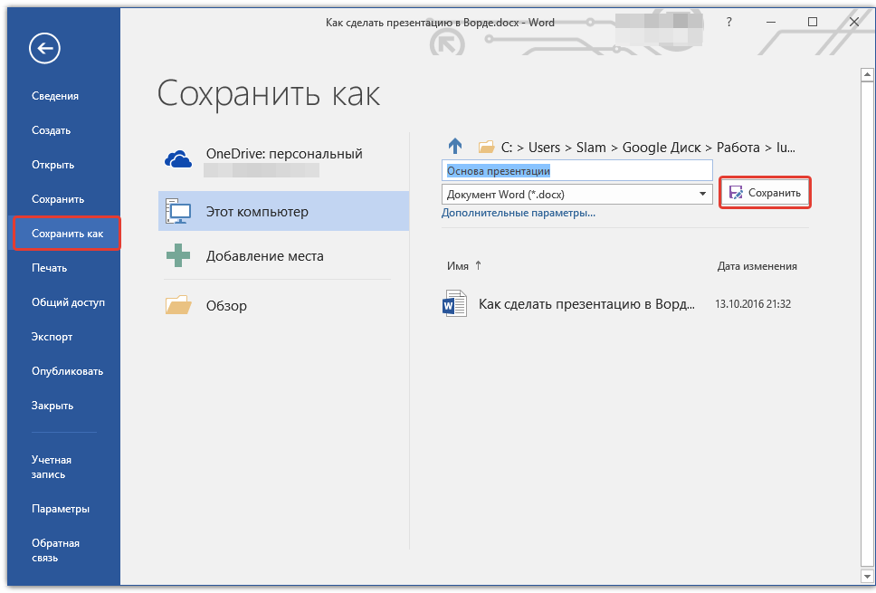 Пройдите в «Файл-Сохранить и отправить-Изменить тип файла-Сохранить как файл другого типа-Сохранить как»