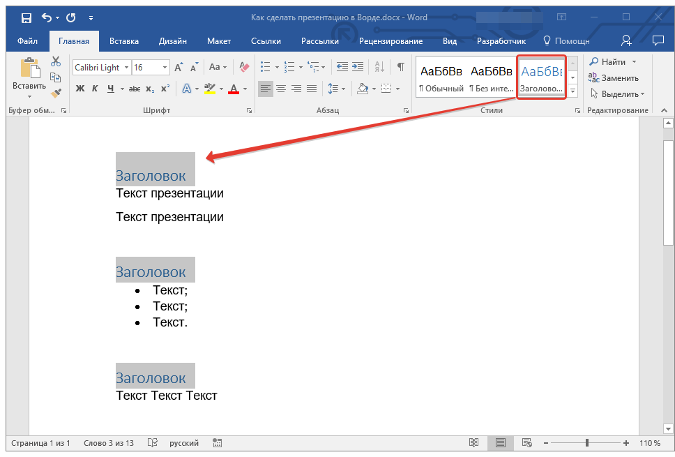 3. Измените стиль заголовков и текста под ними, чтобы PowerPoint смог автоматически расположить каждый фрагмент по отдельным слайдам.