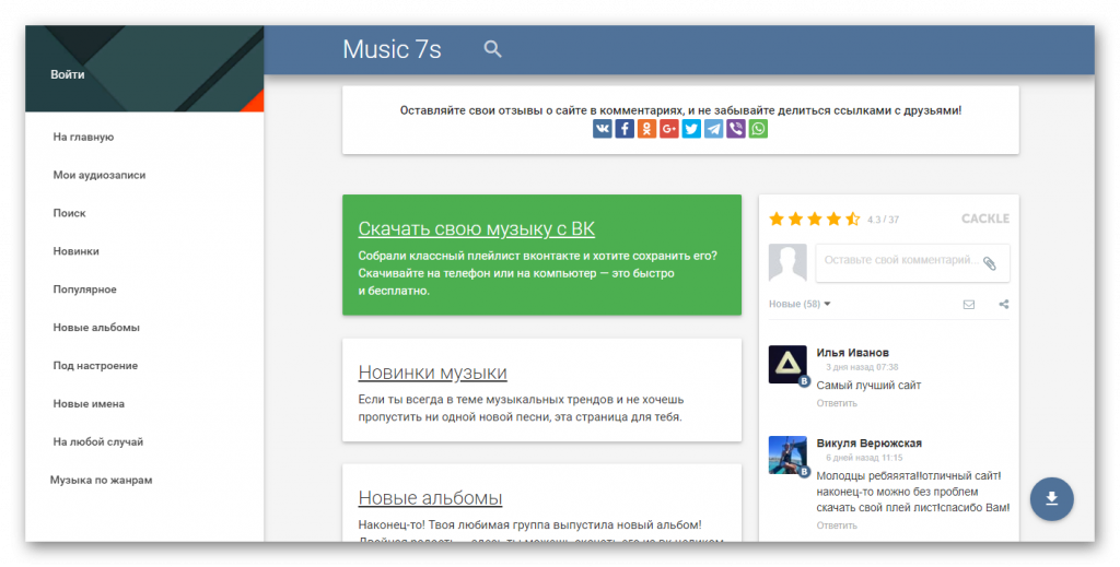 Очередной веб-сервис, противостоящий борьбе администрации ВКонтакте с бесплатным прослушиванием музыки. Достоинства Music7s аналогичны таковым у Kiss VK. Чтобы воспользоваться услугами сервиса, не нужно ничего скачивать или устанавливать на компьютер. Нужно просто авторизоваться на сайте Music7s и все.