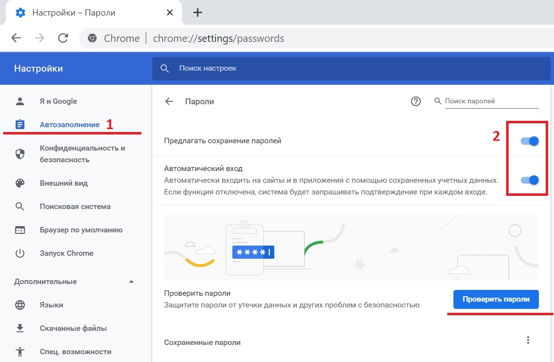 Рис. 4 Как настроить сохранение паролей для сайтов в Хроме