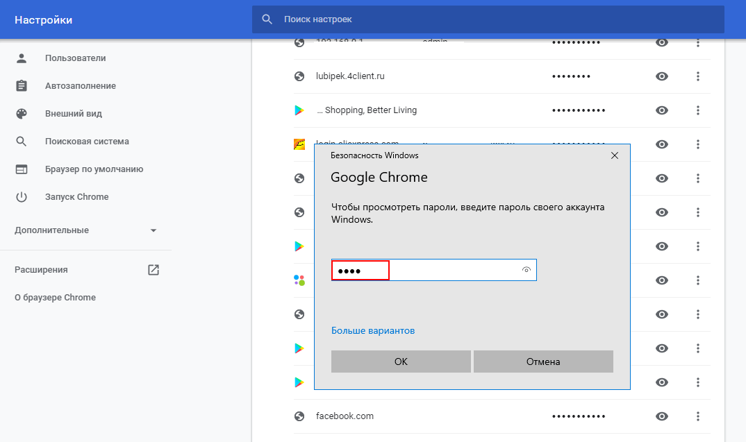 Рис. 7 – просмотр паролей в браузере «Хром»