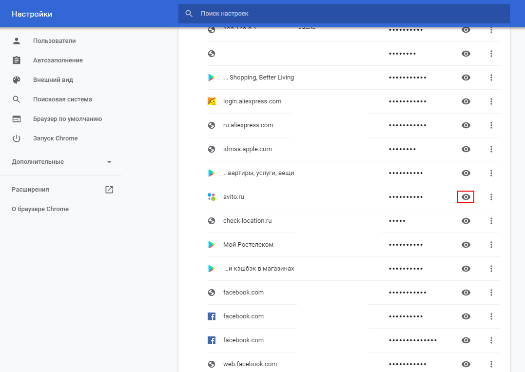 - Чтобы увидеть пароль под звездочками, нужно выбрать нужный сайт, нажать на значок (значок в виде глаза) «Показать пароль» справа от адреса сайта. На нашем примере (Рис.5), мы выбрали сайт Avito.ru, и хотим посмотреть какой у нас там пароль. Для этого нужно нажать на значок «Показать пароль» (Рис.5).
