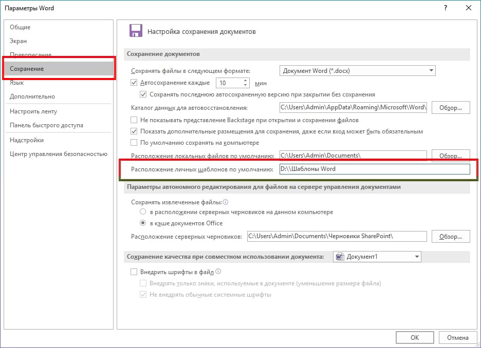 В меню «Файл» выберите команду «Параметры». В окне «Параметры Word» выберите категорию «Сохранение» слева. Справа введите путь, в котором Вы хотите сохранить шаблоны в поле «Расположение личных шаблонов по умолчанию». Нажмите «ОК», когда закончите.