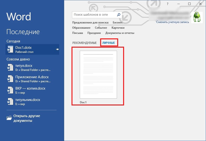 Его всплывающий экран показывает кучу шаблонов, которые являются встроенными или загружаемыми. В верхней части окна нажмите ссылку «ЛИЧНЫЕ», чтобы отобразить Ваши собственные шаблоны. Затем все, что Вам нужно сделать, это щелкнуть по нужному шаблону, и Word создает на его основе новый документ.