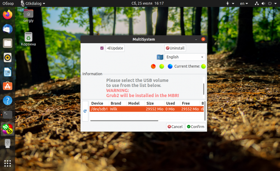 Выберите нужный USB диск и нажмите кнопку Confirm. Может появиться сообщение, что флешка была без метки, поэтому утилита сама присвоила ей метку. После этого придется отключить и подключить флешку, затем перезапустить MultiSystem и опять выбрать флешку.
