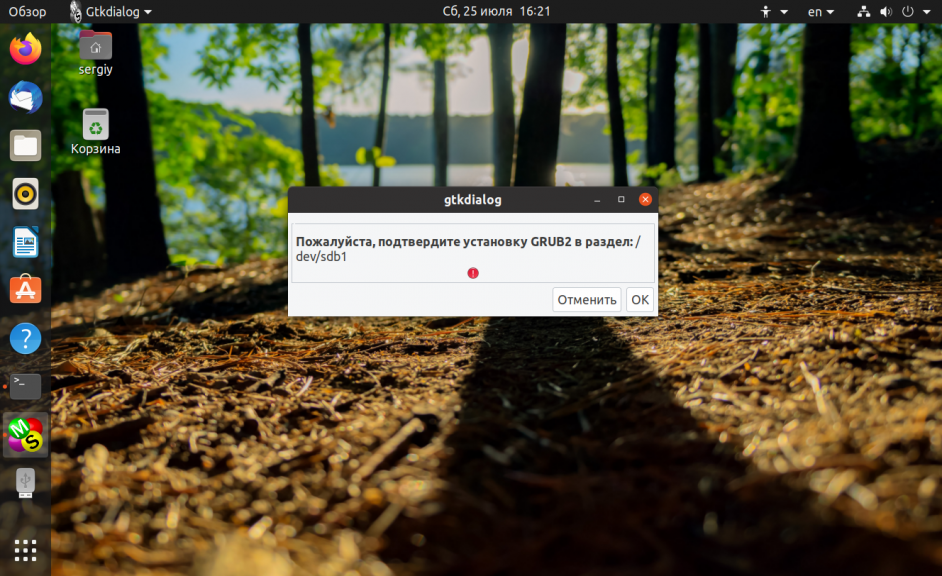 После этого подтвердите установку на нее загрузчика Grub2: