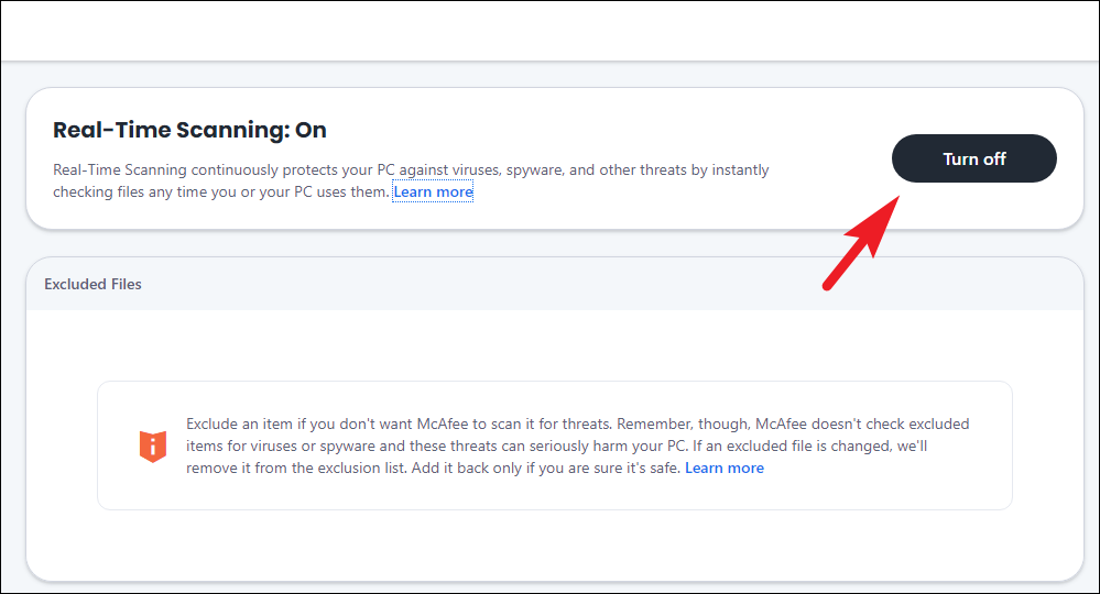 Теперь щелкните раскрывающееся меню и выберите предпочтительную продолжительность времени, если вы хотите включить защиту автоматически. Если вы хотите включить защиту вручную, выберите вариант «Никогда». Затем нажмите кнопку «Выключить» в правом нижнем углу панели, чтобы отключить сканирование McAfee в реальном времени.