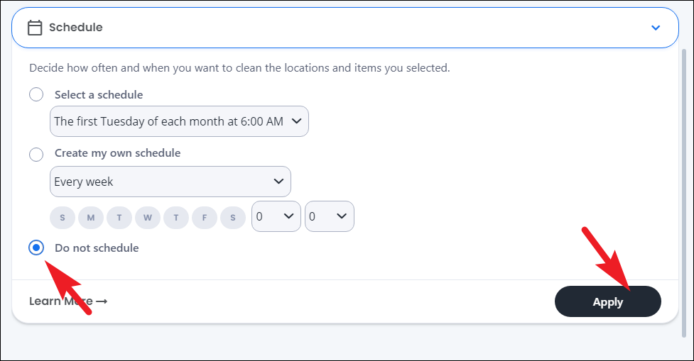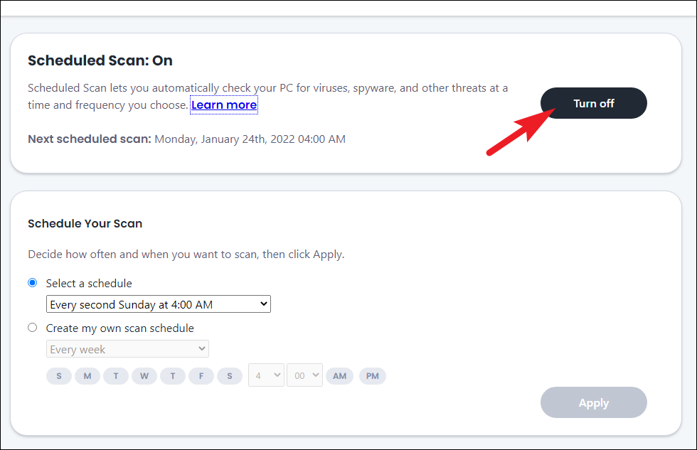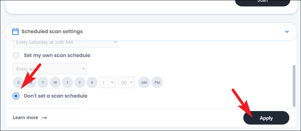 После этого прокрутите вниз показанные параметры, пока не найдете «Не устанавливать расписание сканирования», и щелкните переключатель, предшествующий параметру. Затем нажмите кнопку «Применить», чтобы сохранить изменения.