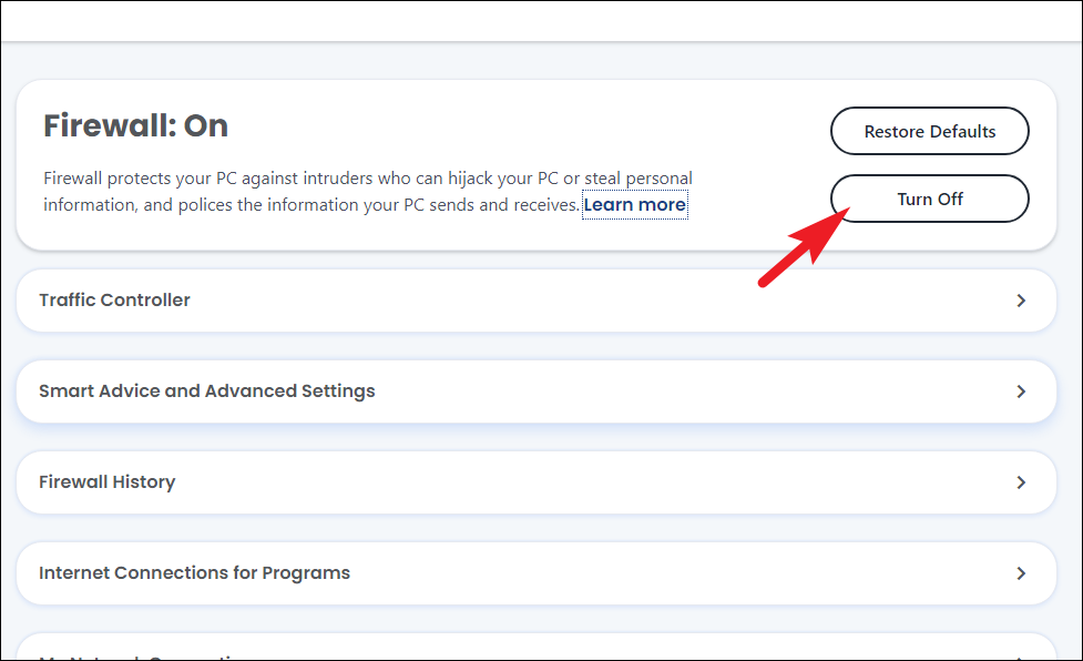 Теперь нажмите кнопку «Выключить» на экране «Настройки брандмауэра», чтобы продолжить. Это откроет отдельное окно наложения на вашем экране.