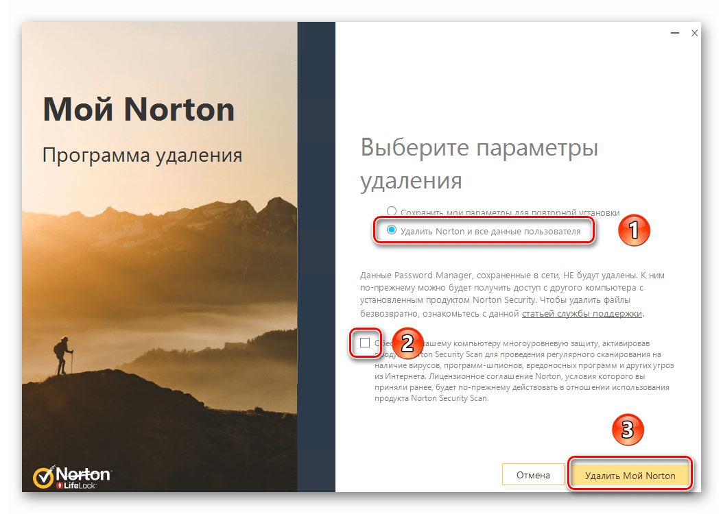 Спустя некоторое время на экране появится дополнительное окно с параметрами удаления. В нем следует активировать строчку «Удалить Norton и все данные пользователя». Будьте внимательны и обязательно уберите галочку возле блока с мелким текстом. Если это не сделать, в системе останется компонент Norton Security Scan. В завершении нажмите кнопку «Удалить мой Norton».