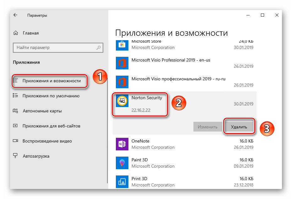 В появившемся окне будет автоматически выбран нужный подраздел – «Приложения и возможности». Вам остается лишь опуститься в самый низ правой части окна и найти в списке программ Norton Security. Нажав на строку с ним, вы увидите выпадающее меню. В нем нажмите кнопку «Удалить».