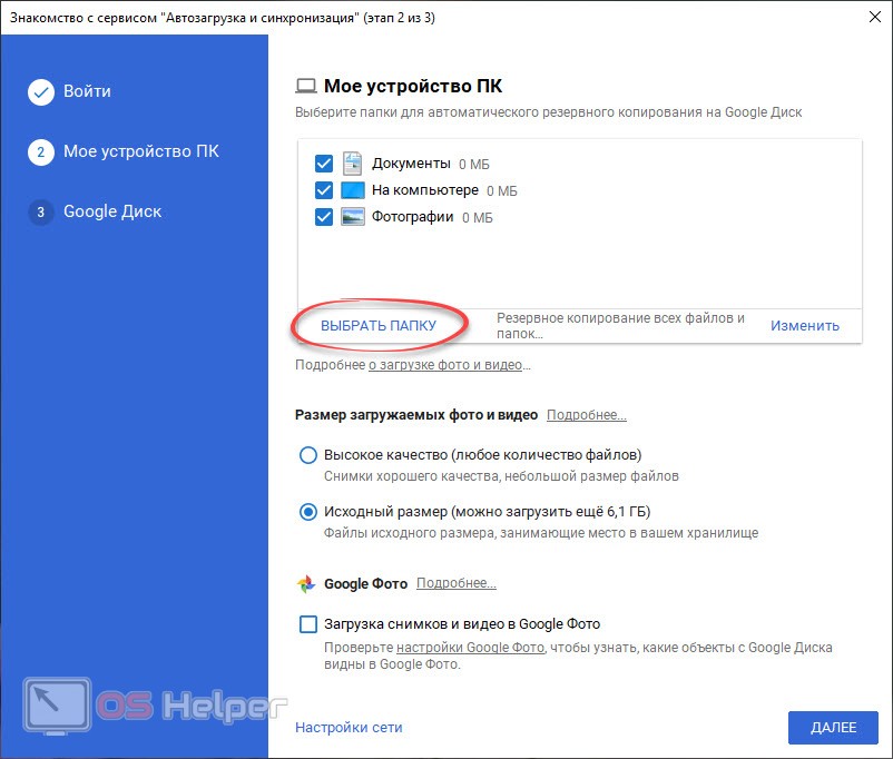 - В нижней части окна мы можем настроить автозагрузку всех фотографий на сервис Google фото. Причем тут можно отрегулировать качество конечного файла. Вы можете сжимать фотографии для экономии места на облаке либо оставлять их в оригинальном качестве. Когда все настройки будут внесены жмем кнопку «Далее», расположенную в правом нижнем углу окошка. Нам предложат синхронизировать содержимое Google-диска с компьютером. Это отдельный каталог, в котором хранятся данные, например, скопированные со смартфона.