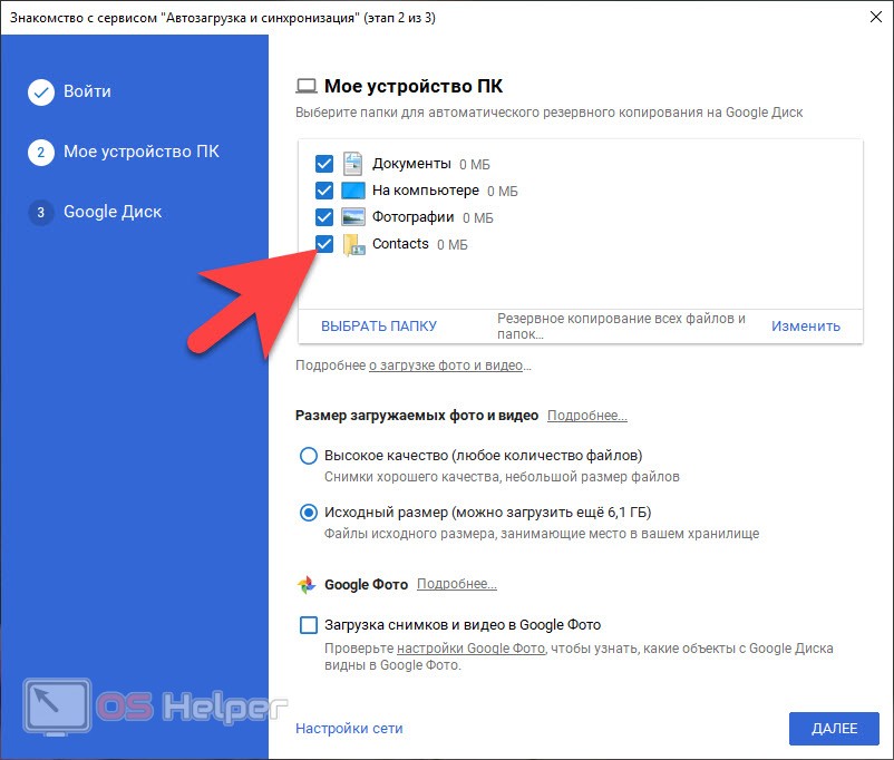 Google предложит отметить папки для резервного копирования данных. Выбираем нужные папки и жмем «Далее».