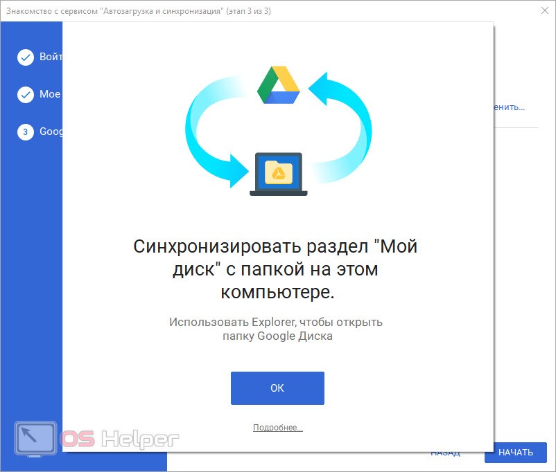 Шаг 3. В случае успешной процедуры, открывается стартовое окно. Теперь, чтобы ответить на вопрос как установить и настроить Google диск, остается пара шагов. Жмем кнопку «Начать».