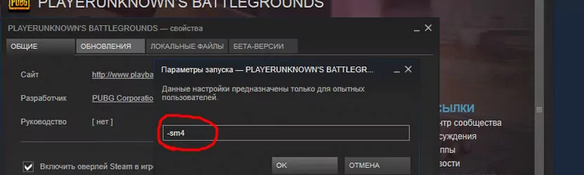 Чтобы применить этот параметр запуска в PUBG, откройте Steam, нажмите на игре правой кнопкой мыши, выберите «Свойства», затем — «Установить параметры запуска». В поле вводите «-sm4» без кавычек. В итоге все должно выглядеть как на картинке:
