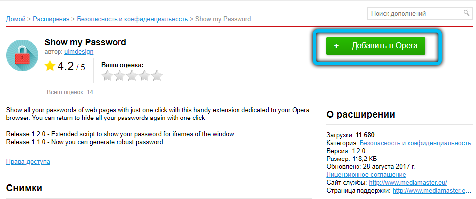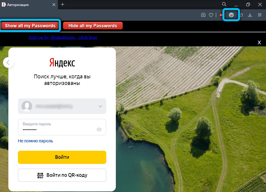 Однако в Opera после нажатия правой кнопочкой мыши нам придётся выбрать пункт с названием «Просмотреть код элемента». А ещё в этом браузере есть возможность воспользоваться специальным встроенным расширением. Благодаря открытому исходному коду не стоит опасаться подцепить вирусы на свой домашний или рабочий ПК. В Opera оно называется Show my Password. После того, как оно будет установлено, нажимаем на его значок. Щёлкаем по кнопке, предлагающей видеть скрытые пароли и получаем готовый результат.