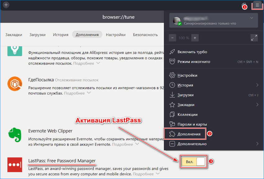 В Яндекс браузере расширение LastPass уже предустановлено, поэтому его нужно только включить. Для этого перейдите в раздел «Дополнения» через меню, затем в списке найдите менеджер паролей и переведите ползунок в активное состояние.