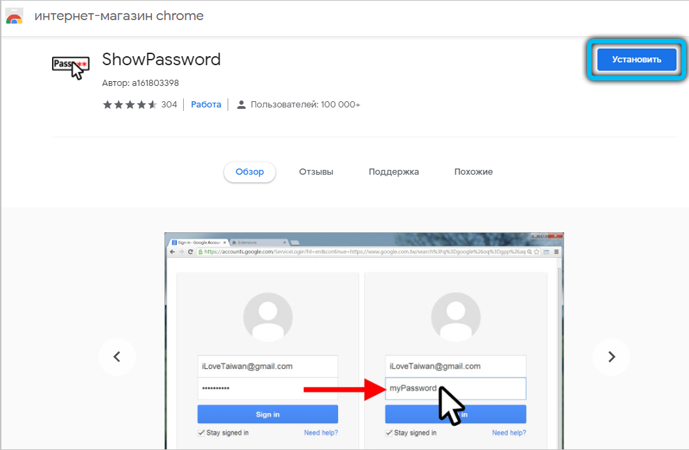 У браузера Google Chrome есть возможность подгрузить расширение ShowPassword. Оно абсолютно безопасно, а потому им можно смело воспользоваться. Но прежде, чем работать с ним, его нужно установить. После этого переходим на любой сайт, требующий регистрации и идентификации. Достаточно навести курсором мышки на поле с названием Password. Сразу же пароль станет видимым для пользователя. К тому же самому результату приводит единоразовый щелчок на соответствующем поле.
