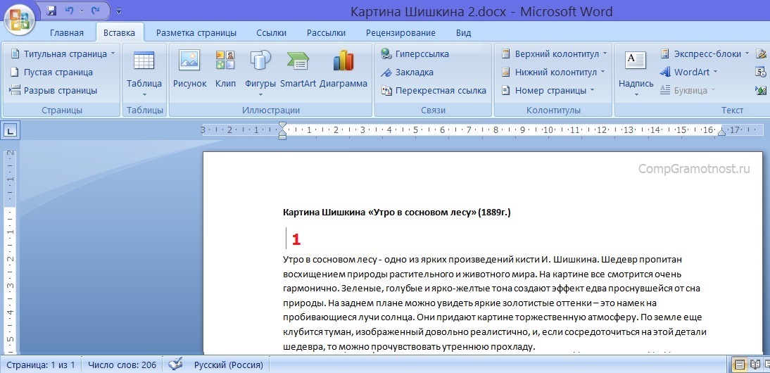 Допустим, надо вставить рисунок сразу после заголовка описания картины Шишкина.