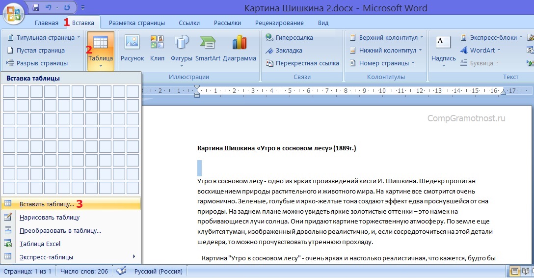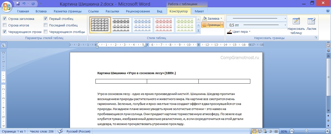 После клика по кнопке «ОК» хорошо видно, что таблица из 3-х столбцов и 1-й строки добавлена в текст описания картины «Утро в сосновом лесу» (рис. 4).