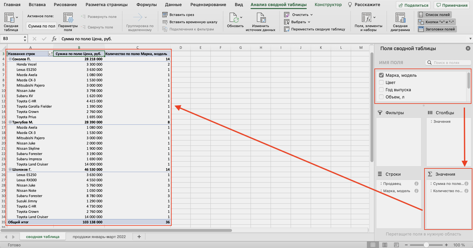 Чтобы сводная таблица самостоятельно суммировала эти значения, перетащим поля «Марка, модель» и «Цена» в область «Значения».