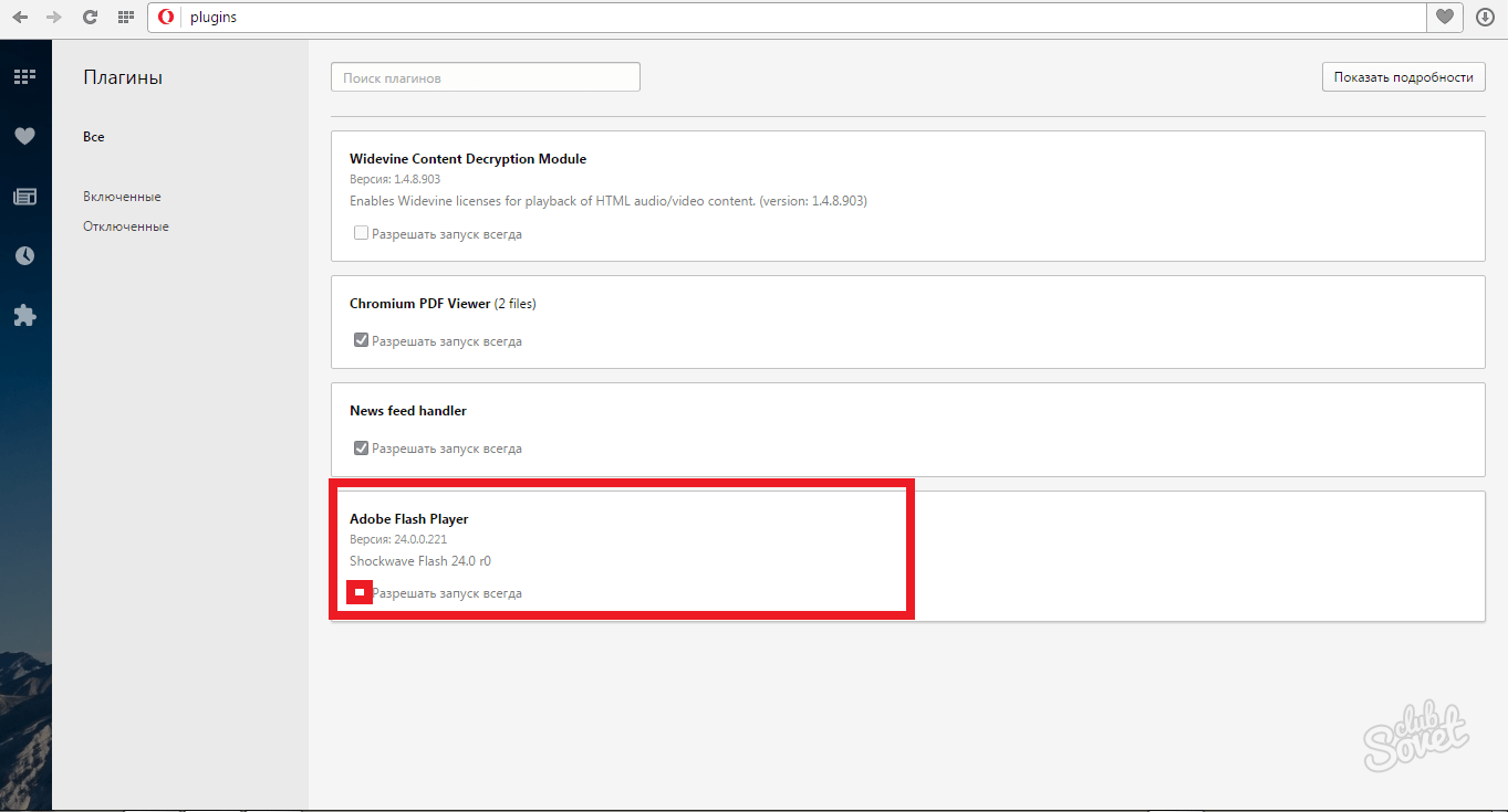 Способ включения Adobe Flash Player в браузере Опера отличается от описанного метода выше, здесь вам может понадобиться работа с адресной строкой браузера.