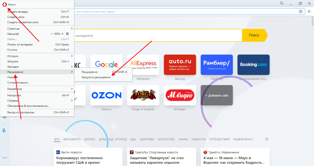 Зайти в Меню интеренет-обозревателя, выбрать Расширения, далее Загузить расширения.