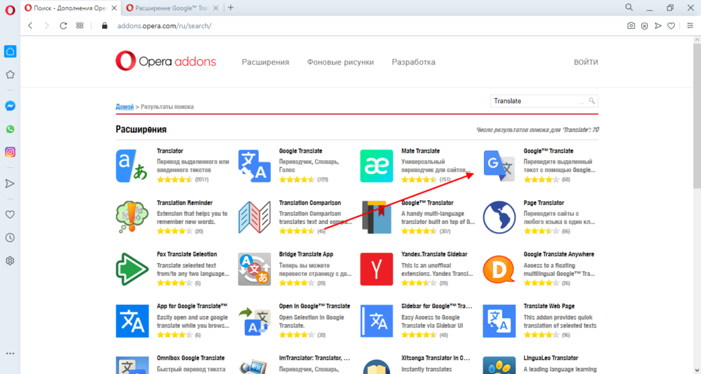 - Магазин Опера предложит несколько альтернативных переводчиков, которые можно установить в браузере. Выберите оптимальное расширение по своему усмотрению.