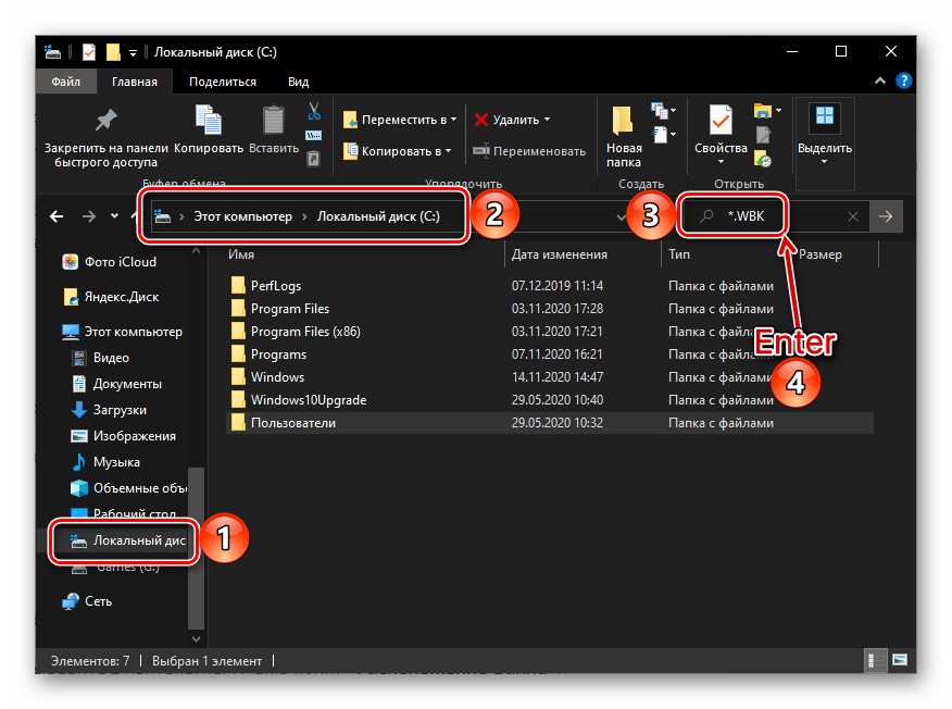 - Откройте «Проводник», перейдите в корень системного диска (в нашем примере таковым является (C:)), скопируйте и введите в его поисковую строку первое из указанных ниже значений. Нажмите «Enter» для начала поиска. *.WBK*.ASD