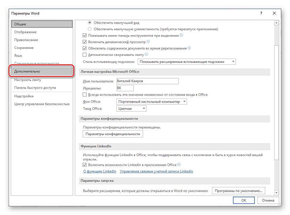 - В окне «Параметры Word» выберите на левой панели раздел «Дополнительно».