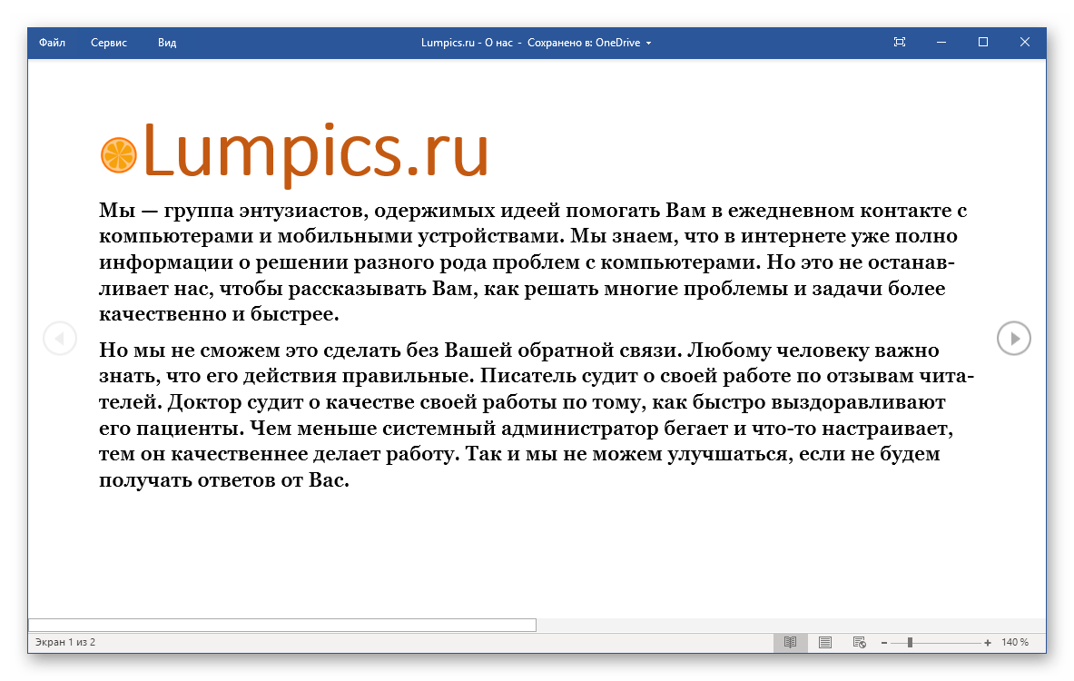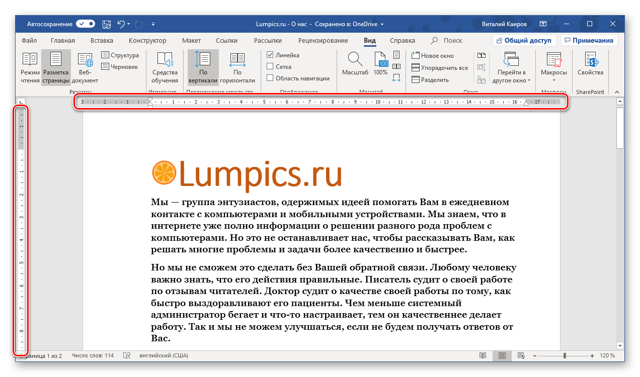 Линейка не отображается или отображается только горизонтальноПо умолчанию, и чаще всего этот параметр не меняется пользователем, работа с документом Word осуществляется в «Режиме разметки». Это стандартное для программы представление, и если включить в нем «Линейку», она появится как в горизонтальной, так и в вертикальной плоскости. Во всех остальных режимах отображения будет показана либо только горизонтальная линейка, либо она будет отсутствовать вовсе. Наглядный пример: