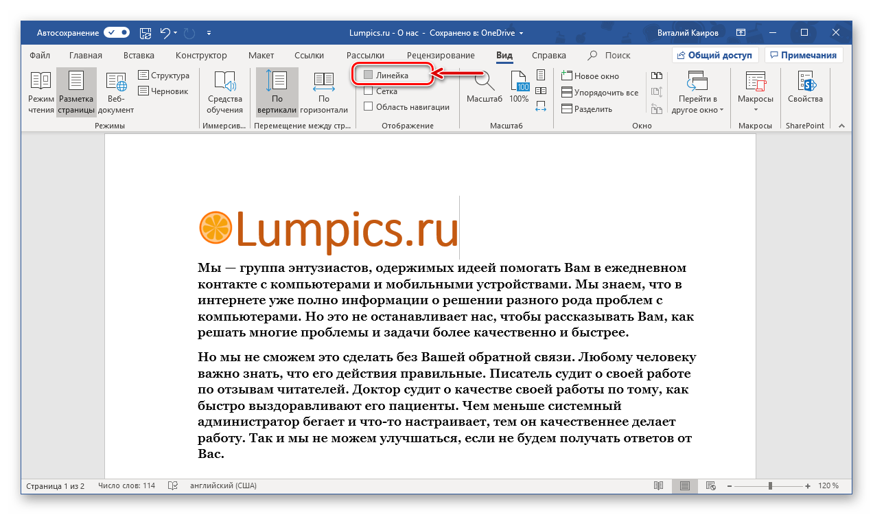 Линейка не отображается или отображается только горизонтально По умолчанию, и чаще всего этот параметр не меняется пользователем, работа с документом Word осуществляется в «Режиме разметки». Это стандартное для программы представление, и если включить в нем «Линейку», она появится как в горизонтальной, так и в вертикальной плоскости. Во всех остальных режимах отображения будет показана либо только горизонтальная линейка, либо она будет отсутствовать вовсе. Наглядный пример: