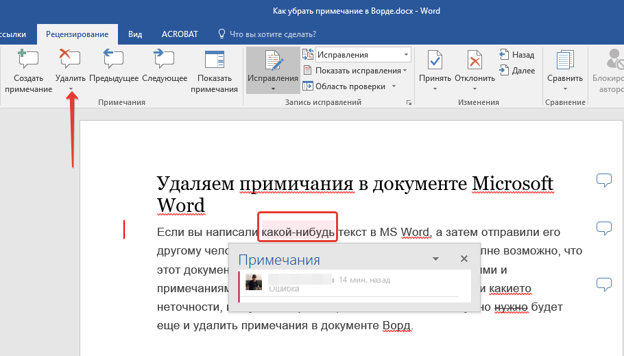 Если Вам нужно не просто скрыть, а именно удалить ремарки, которые отображаются сбоку страницы документа в Ворде, тогда кликните по ненужному, чтобы выделить его. Затем на вкладке «Рецензирование» нажмите «Удалить», и оно исчезнет из документа.