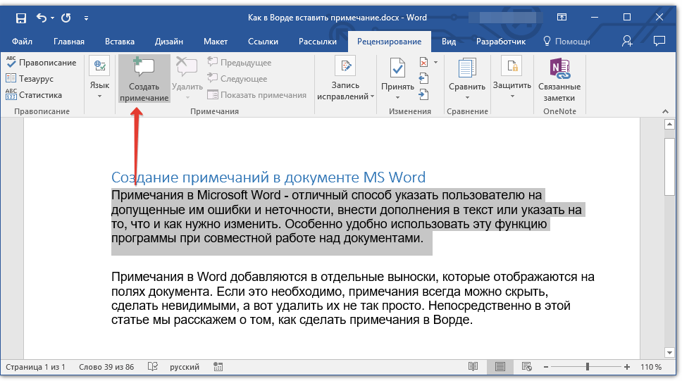 2. Перейдите во вкладку “Рецензирование” и нажмите там кнопку “Создать примечание”, расположенную в группе “Примечания”.