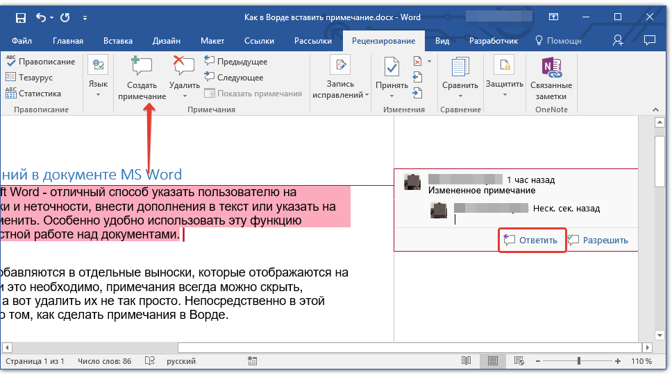 - Совет: Если вы хотите ответить на уже существующее примечание, кликните по его выноске, а затем уже по кнопке “Создать примечание”. В появившейся выноске введите необходимый текст.