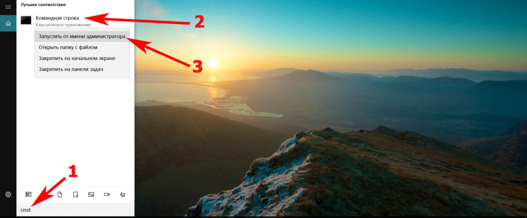 Клацаем на «Поиск в Windows», прописываем команду «cmd». На черном окошке клацаем правой кнопкой мыши и делаем выбор запуска от имени Администратора.