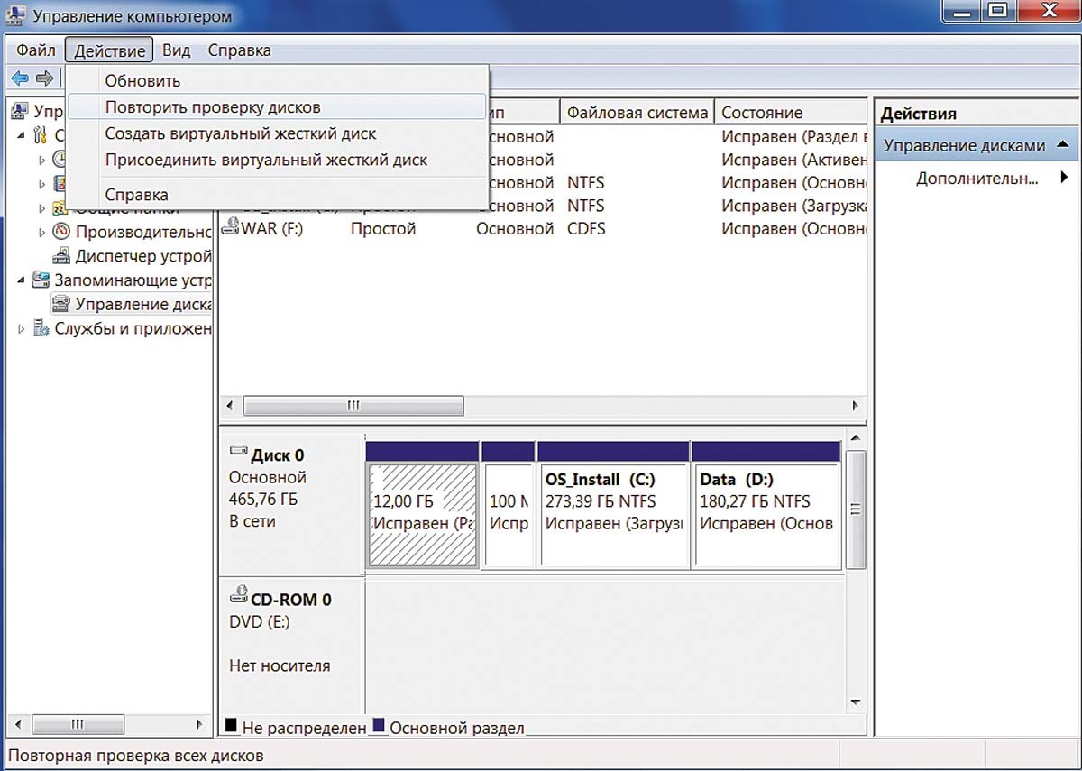Возможно, что для использования жесткого диска его понадобится активировать из Панели управления. Для этого щелкните кнопку «Пуск» и далее «Панель управления», затем «Администрирование | Управление компьютером | Управление дисками». Выберите «Действие», затем «Повторить проверку дисков». Запустить данную утилиту также получится, если ввести в строке «Выполнить» команду «diskmgmt.msc».