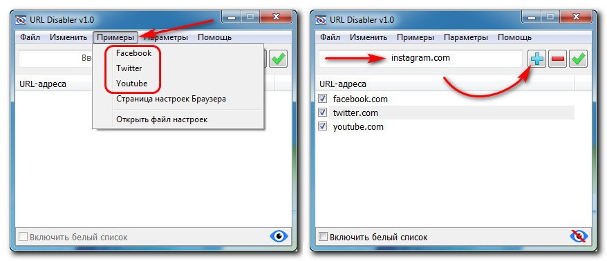 У URL Disabler есть примеры сайтов для добавления в список блокировки. Кликаем их, и они добавляются в этот список. А чтобы добавить свой какой-то сайт в список блокировки, в поле ввода утилиты вписываем его домен. Затем жмём голубую кнопку-плюсик.