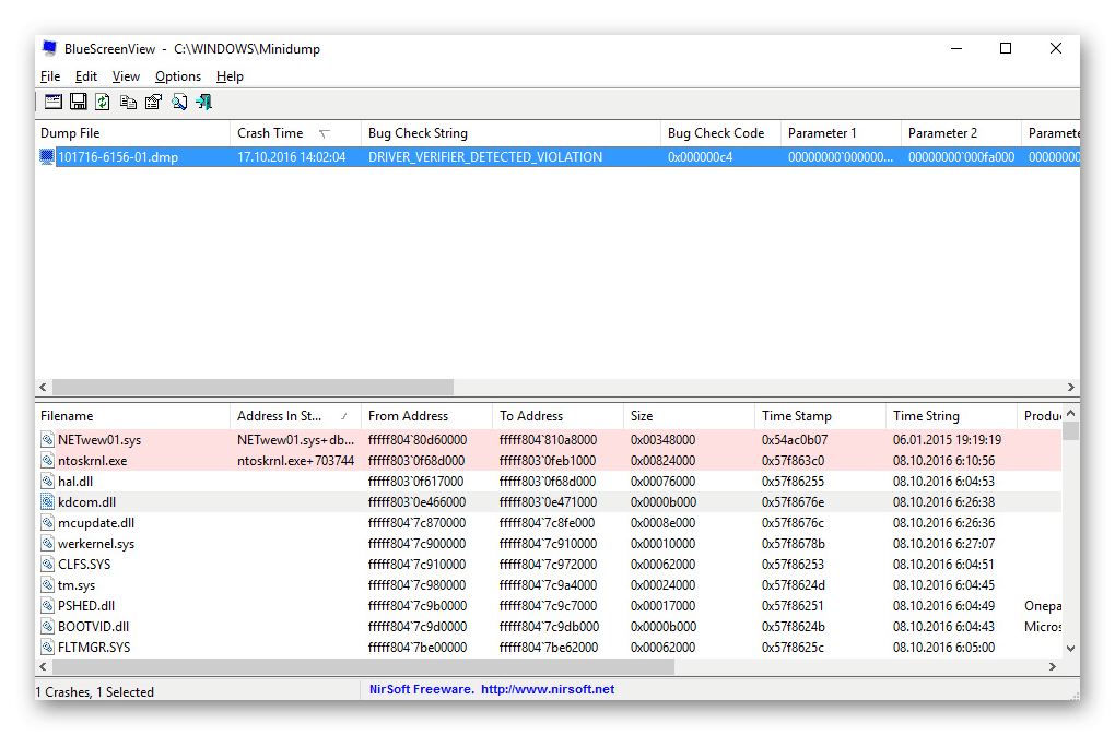 Мы рекомендуем использовать BlueScreenView. Открываем с ее помощью файл дампа и видим приблизительно следующую картину:
