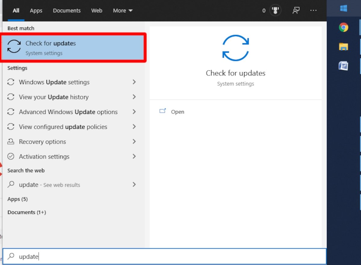 С самого начала введите обновление и нажмите Проверить наличие обновлений