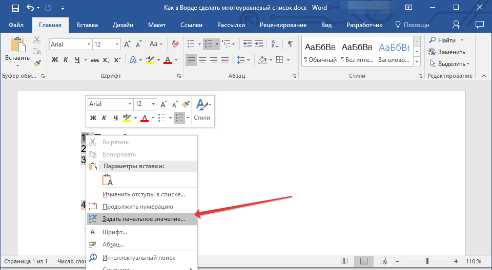 Для того чтобы изменить значение для продолжения номеров, выделите нужный и в соответствующем выпадающем списке выберите пункт «Задать начальное значение».
