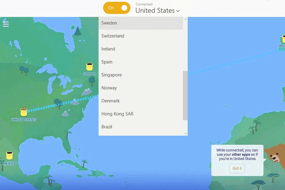 TunnelBear значительно облегчает просмотр иностранных сайтов, недоступных жителям России, и позволяет играть в любые игры, которые заблокированы для российских геймеров. Имеет приятный интерфейс, отличную защиту персональной информации пользователя и может похвастаться стабильным подключением.