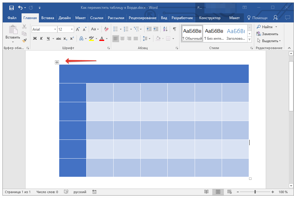 Шаг 1. Курсор поместите на таблицу, в ее верхний левый угол. Кликните на значок с четырьмя стрелками. Не отпуская мышки, переместите таблицу.