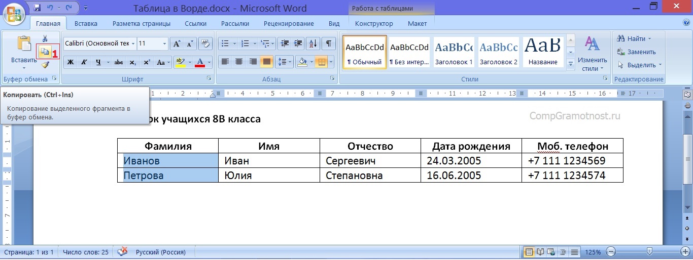 Нажмите правой кнопкой мыши в любом месте выделенной таблицы и выберите пункт «Копировать». Тем самым таблица скопируется в буфер обмена.