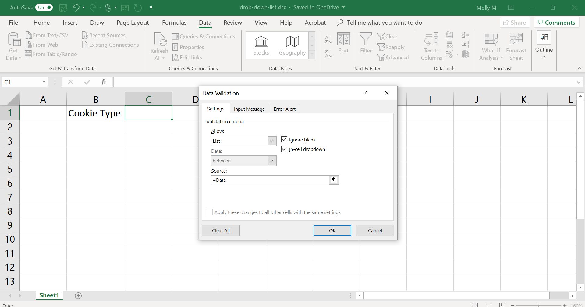 - Добавить именованный диапазон к проверке данных: Наконец, вы соберете все вместе и определите источник раскрывающегося списка (т. Е. Ранее названный вами диапазон).
