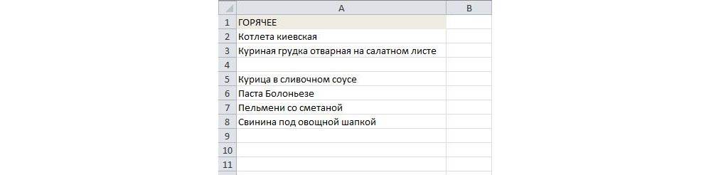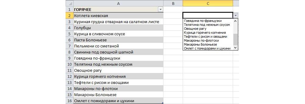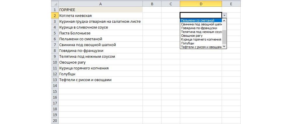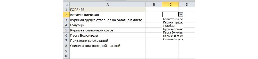 В том случае если в названии категории все же содержится пробел (например, Японская кухня), то одним из вариантов решения является использование нижнего подчеркивания вместо пробела в имени диапазона (Японская_кухня). Создадим первый выпадающий список в ячейке A10, состоящий из категорий блюд (Пицца, Суши и Паста)