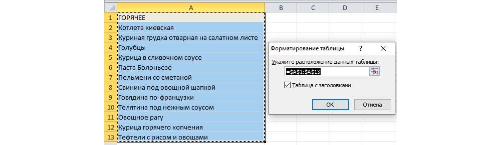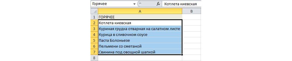 • для начала создается один, общий список для всех названий. Выделяются ячейки с наименованиями посредством контекстного меню;