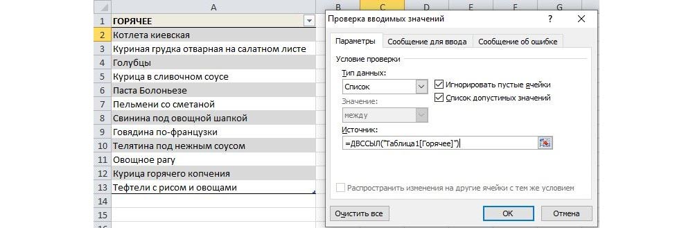 • кликнуть по верхней части столбика, где указаны единицы измерения, зайти в проверочное окно и в источнике указать «=ДВССЫЛ(A2)», вместо А2 может быть любая ячейка с наименованием продукта;