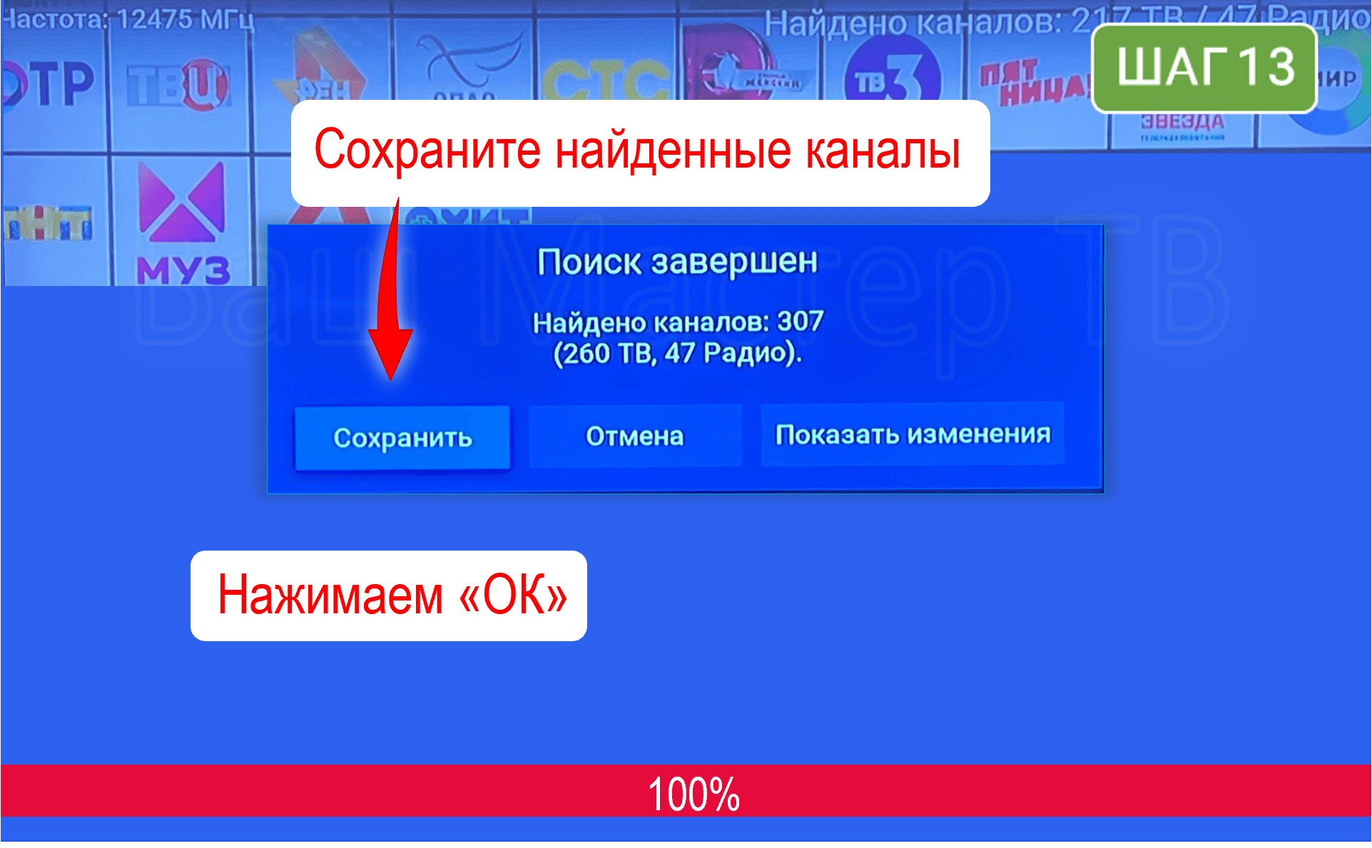 Шаг 13 ➠ После окончания поиска (шкала внизу экрана заполнится на 100%) появится информационная табличка с общим количеством найденных каналов. Обязательно нажмите «ОК», чтобы сохранить каналы.
