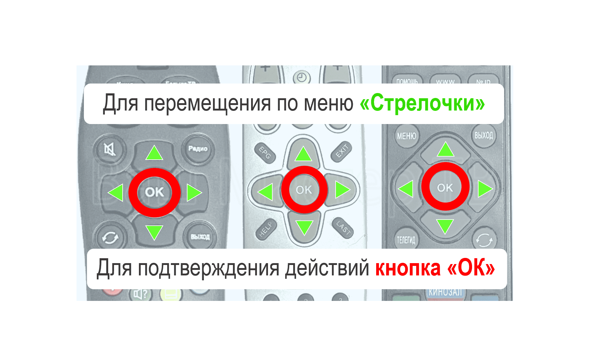 Для управления всеми дальнейшими шагами используйте стрелочки на пульте (для перемещения между пунктами) и кнопку «ОК» (для подтверждения своего выбора).
